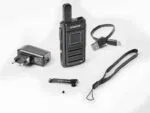 Este walkie talkie se entrega con su cargador, cable de carga tipo microUSB y clip para el cinturón.
