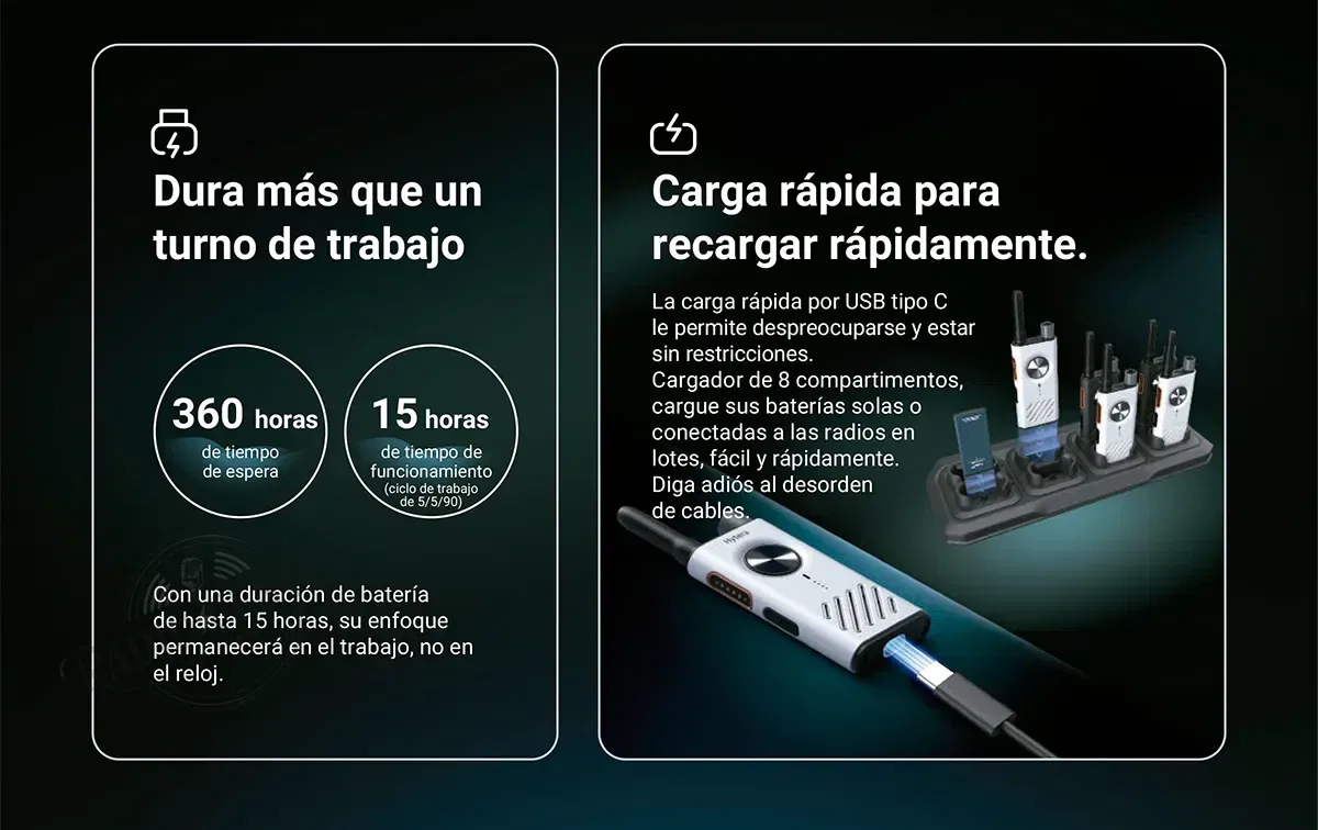 - 27 horas de autonomia: la bateria de 2200 mAh es reemplazable por el usuario en segundos. Tener una bateria de repuesto cargada equivale a un turno doble sin cortar comunicaciones. Compatible con el cargador multiple CM31 de 8 posiciones para gestionar flotas enteras.