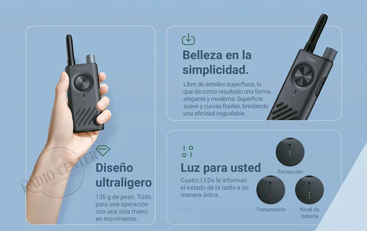 El diseno del chasis, inspirado en lineas arquitectonicas clasicas segun Hytera, no es solo estetica: la distribucion de botones esta optimizada para uso con una sola mano, con el PTT lateral accesible con el pulgar sin soltar el equipo. El altavoz de 3 W alcanza los 90 dBA, audible en entornos ruidosos como cocinas industriales, almacenes o eventos.