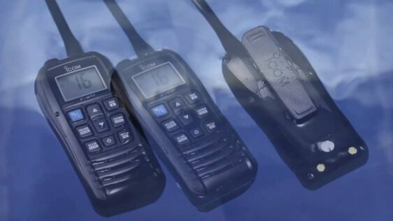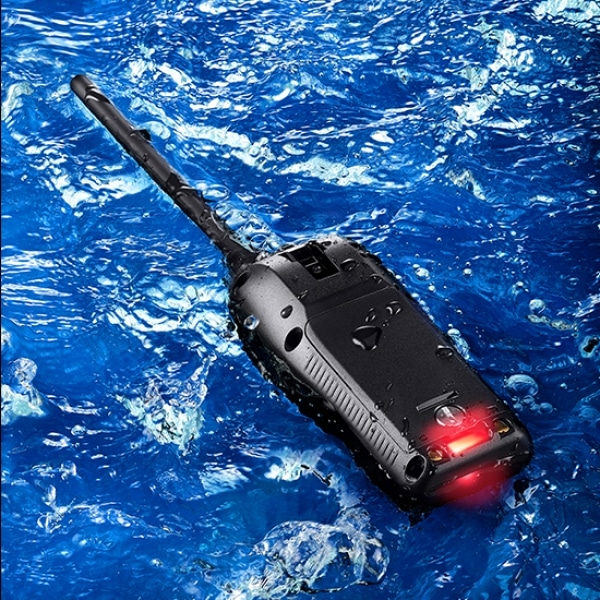 Equipo portátil VHF de 6 vatios con una característica peculiar. ¡Cuando se cae al agua flota y emite destellos de flash para recuperarlo en caso que no haya visibilidad!. Con una batería que soporte hasta 12 horas de funcionamiento.