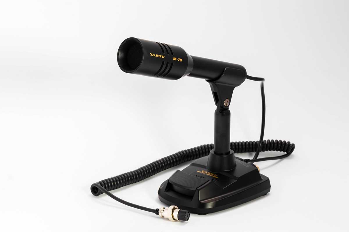 Micrófono de sobremesa Yaesu M‑70 para emisoras HF con conector de 8 pines, elemento de condensador direccional, filtro de corte bajo integrado y botón PTT con bloqueo. Compatible con equipos Yaesu como FTDX‑9000, FTDX‑5000, FTDX‑3000, FTDX‑1200, FT‑991A, FT-450, FT‑891, entre otros.