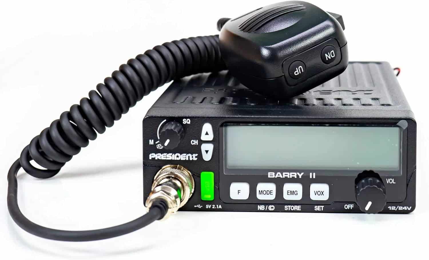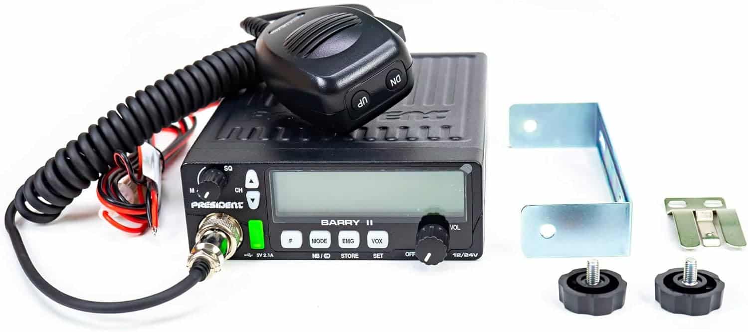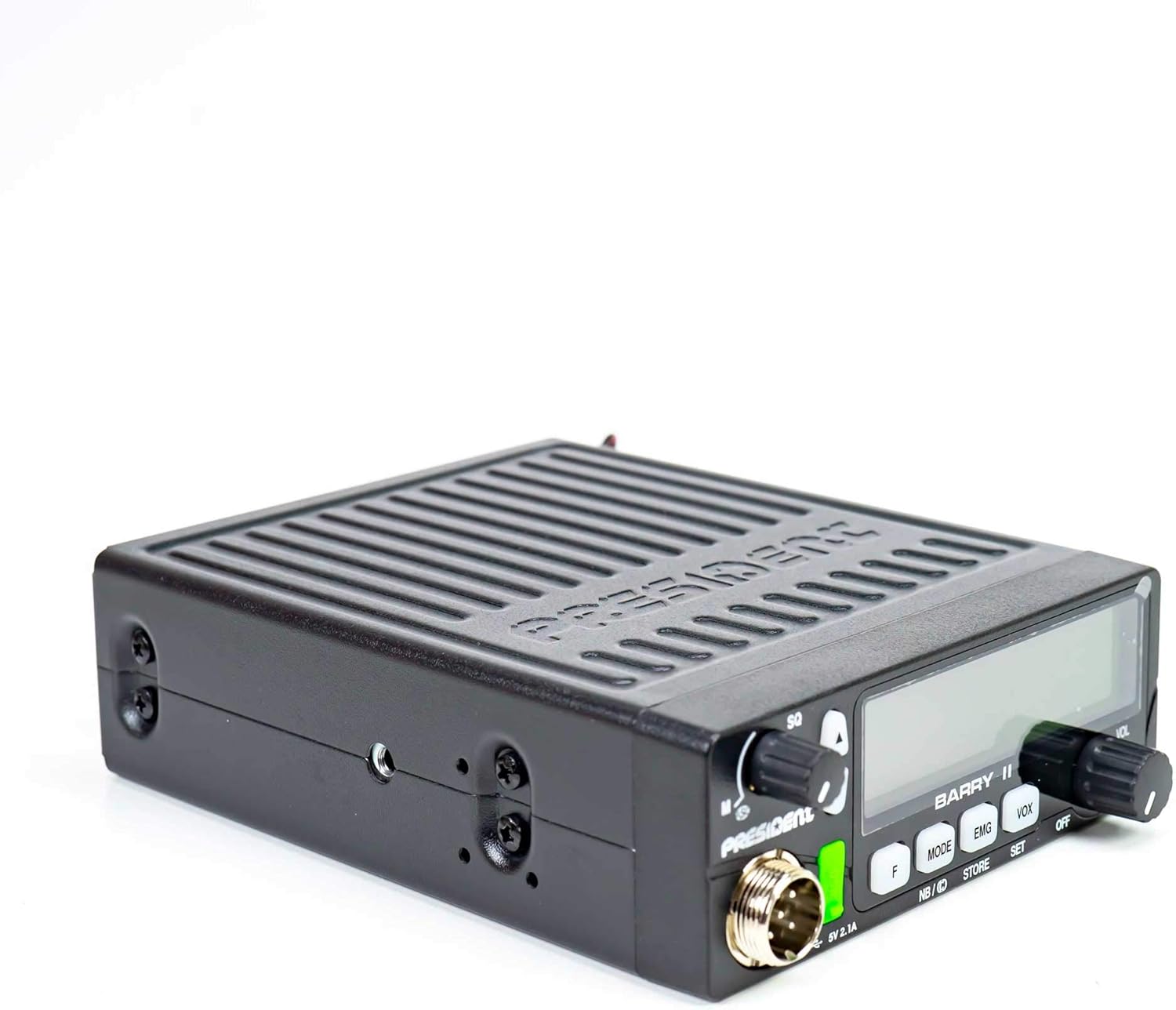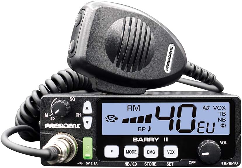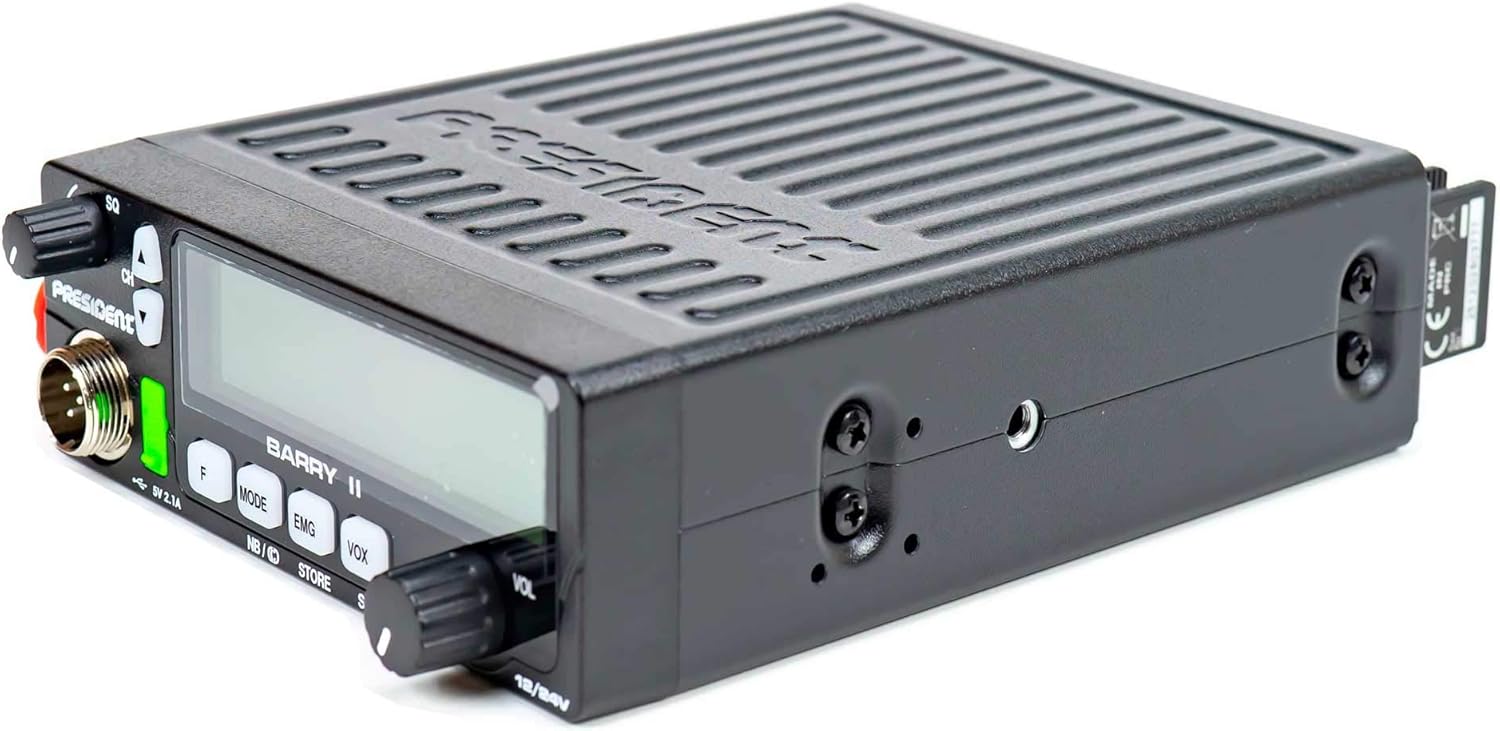 Nueva versión + del transceptor de banda ciudadana CB-27 Mhz President Barry II, con 40 canales en AM y FM, dispone de 7 colores a elegir para su gran display LCD, podemos instalarla a 12 y a 24 V, incluye roger-beep, Talkback, toma frontal de carga USB, ASC, Re initializacion, subida y bajada de canales desde la emisora y desde el micrófono,… La nueva versión plus incluye NCR incorporado y canales President, estos canales son privados y nos permiten una comunicación privada entre equipos President que los incluyan.