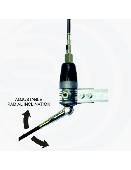 Su bobina de carga está protegida por un aislamiento termoplástico de alta calidad que evita la entrada de humedad. El ángulo del radial es fijo, pero su diseño está calculado para ofrecer una impedancia de 50 Ohms en la mayoría de configuraciones de balcón estándar, lo que minimiza el retorno de RF hacia el equipo de radio y garantiza una comunicación limpia.