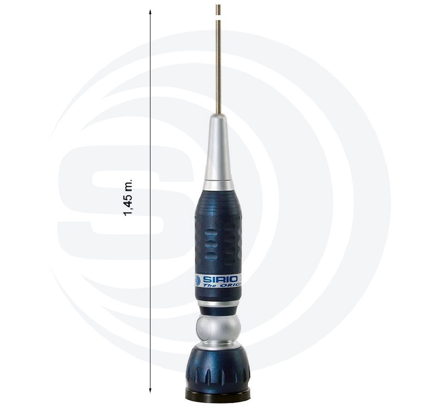 Antena móvil CB serie Turbo Blue Line. Longitud 1,45m. Abatible 90º sin llaves ni útiles adicionales. Ancho de banda 1100 KHz – 100 CH. Antena completa.