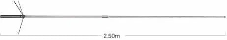 144/430 MHz. 2 x 5/8l – 4 x 5/8l. 6,0 dBi – 8,0 dBi. 200 W. máx. 3 radiales de 52 cms. 250 cms. Fibra de vidrio, 2 tramos. 50 m/s. máx. Conector “N” hembra