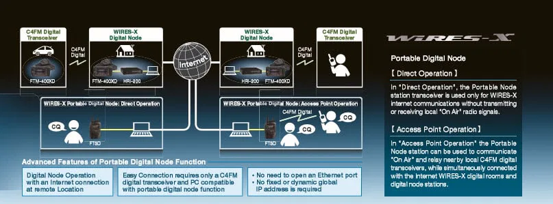 De la misma manera que otros transceptores Yaesu C4FM actuales (FTM400, FT100 …), los usuarios pueden configurar fácilmente un nodo digital portátil y, gracias al cable SCU-39 NO suministrado, aproveche la comunicación por Internet WIRES-X.
